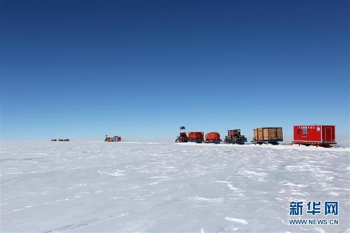 12月25日,中国南极科考队内陆队行进在前往泰山站的途中。新华社 记者刘诗平摄