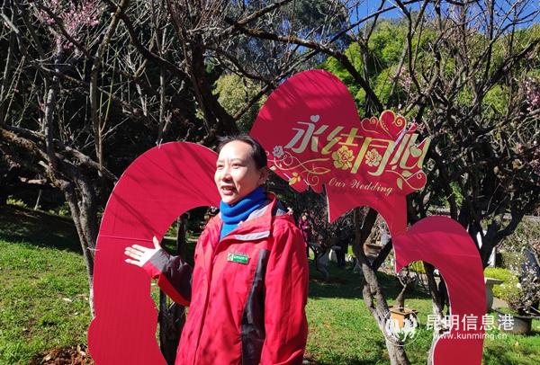 在黑龙潭公园盆景园内,两株梅花树连枝交错在一起,像一对恋人一样相依相偎,细看发现两株树上的花苞颜色并不相同,两株梅树开出的花一白一粉,白的品种是变绿萼,粉的是昆明宫粉。黑龙潭公园梅花专家华工介绍:“这两株梅树20年前就栽在这里,久而久之两株梅花枝条缠绕,美好的形态和寓意吸引了很多恋人、夫妻纷纷到树下合照,形成公园‘永结同心’的网红打卡地,对此我们也专门挂了个红红的‘永结同心’牌在这里。”