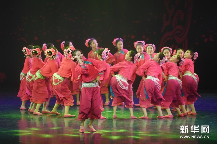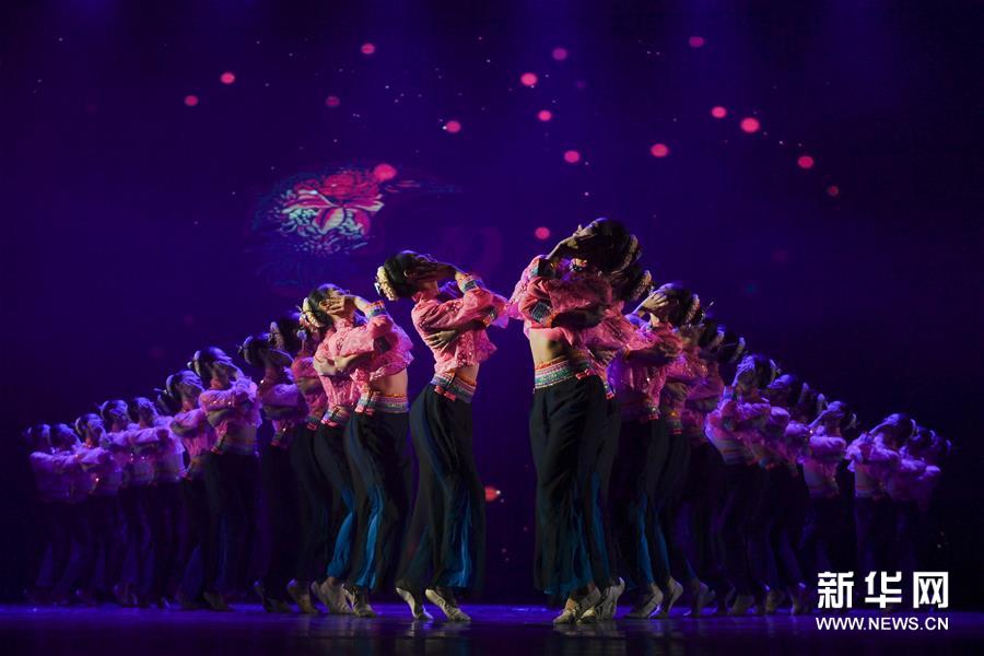 12月25日,在福州大戏院,演员表演群舞《喜》。 12月25日晚,福建优秀舞蹈作品展演活动在福州举行,集中展示福建省近年来舞蹈创作的丰硕成果和舞蹈表演水平,来自全省9个单位的13个作品参加展演。新华社记者 宋为伟/摄