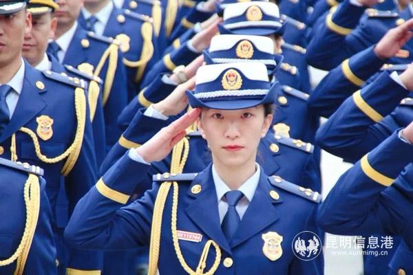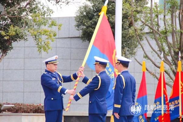 仪式现场,气氛庄重热烈。红色背景板上,“云南省消防总队授旗授衔和换装仪式”字样格外醒目。220余名身着火焰蓝新式制服的消防救援人员精神饱满,整齐列队。