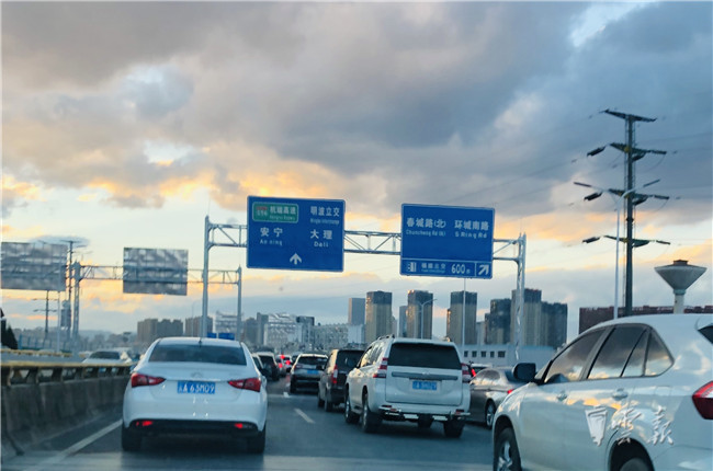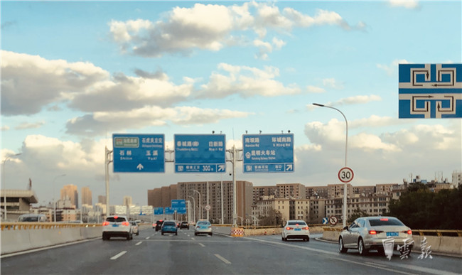 28日17时45分左右,记者驾车从南二环A线滇池路匝道上高架,自西向东行驶,此时二环高架上车辆不多,晚高峰还未形成,车辆行驶顺畅,崭新的标线和标识牌十分醒目,不到十分钟的时间,记者已经通过石虎关立交行驶出城。18时05分,记者在彩云北路与昌宏路交叉口调头,向入城方向行驶,此时道路上的车辆逐渐增多,车速有所放慢。18时12分左右,记者返回至二环快速B线石虎关立交入口,此时车辆已经在入口处排起长队,入城车流与从东二环方向行驶至南二环的车流在此汇聚,导致车流时走时停,晚高峰逐步形成。记者驾车以时速10公里以下的速度行驶,通过福德立交桥后,车速度开始提升,行至官南立交桥后,行车趋于正常,记者于18时35分到达福海立交下桥匝道。在记者下桥匝道口,由于此时南二环双向车流向巨大,导致上下桥匝道出现车辆滞留的现象。