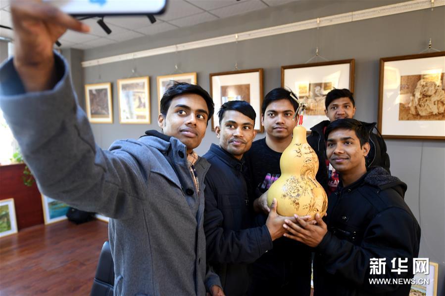 12月28日,河北工业职业技术学院孟加拉国留学生自拍烙画作品纪念照。新华社记者薛东梅/摄