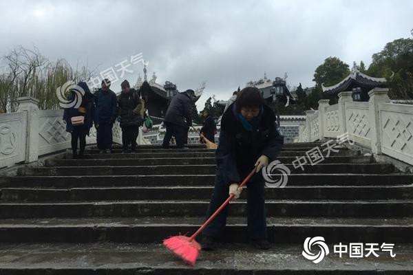 昨天上午,贵阳甲秀楼景区工作人员正在清扫浮玉桥上的结冰。杨春竹/摄