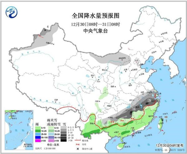 中央气象台预计,今天内蒙古西部、新疆北部、江淮中南部、江汉东部、江南中北部、西南地区东南部等地部分地区有小到中雪或雨夹雪,其中,贵州东南部、湖南中部、江西北部、安徽南部、浙江中北部等地有大雪,湖南东部、江西西部和东北部、安徽南部、浙江西部等地局地有暴雪(10~12毫米)。江南南部、西南地区南部、华南大部和台湾岛大部等地部分地区有小到中雨,其中,台湾岛东北部局地有大雨(25~40毫米)。