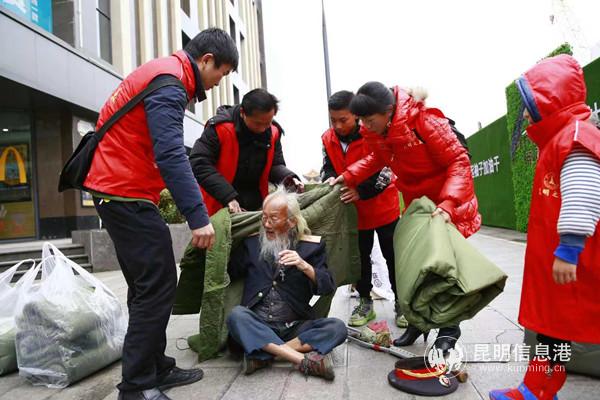 志愿者们从金马碧鸡坊出发,沿着三市街、南屏步行街寻找着流浪者。在看到一位须发尽白的流浪者坐地上乞讨时,志愿者赶紧为老人送去棉大衣,并把棉被垫在老人乞讨的地方,流浪者连声道谢。