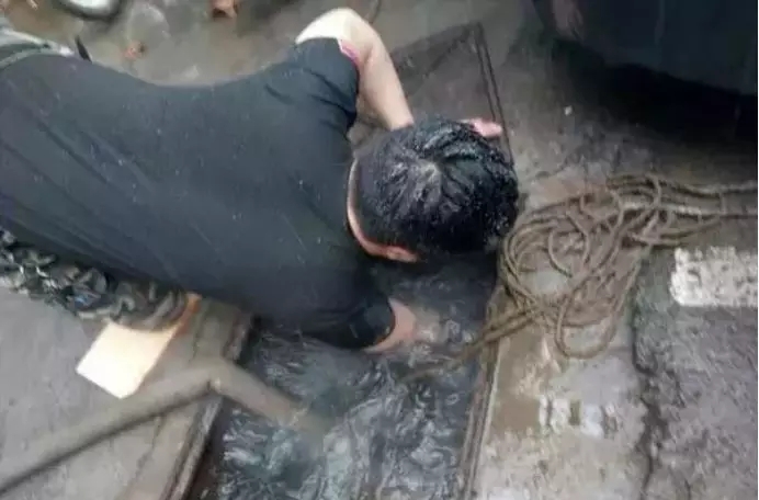 不慎跌入水流湍急的路边排水渠