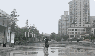 树和建筑倒映在湿漉漉的广场上