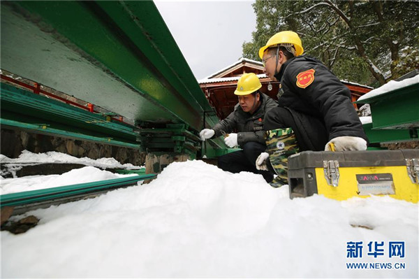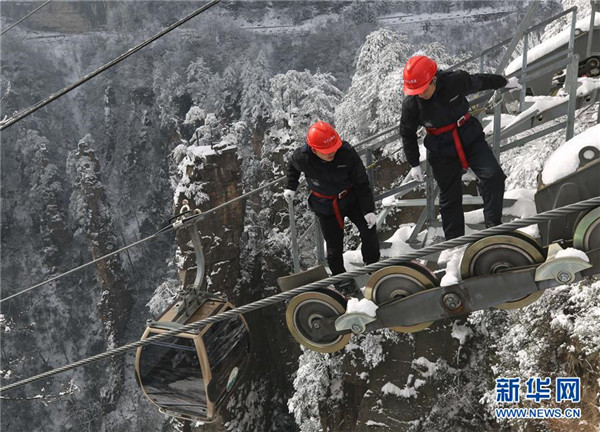 2019年1月1日,湖南张家界武陵源风景区天子山索道工作人员卓名海(左)、杨湘文在索道支架上巡检。 当日是新年第一天,众多劳动者忙碌在工作岗位上。 新华社发(吴勇兵/摄)