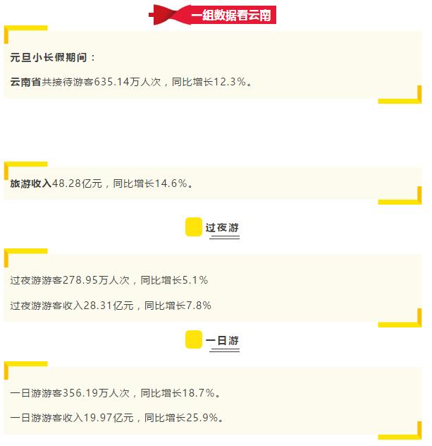 1月2日,记者从云南省文化和旅游厅获悉:据初步统计,元旦小长假期间,全省共接待游客635.14万人次,同比增长12.3%。其中,接待过夜游游客278.95万人次,同比增长5.1%;接待一日游游客356.19万人次,同比增长18.7%。实现旅游收入48.28亿元,同比增长14.6%。过夜游游客收入28.31亿元,同比增长7.8%;一日游游客收入19.97亿元,同比增长25.9%。