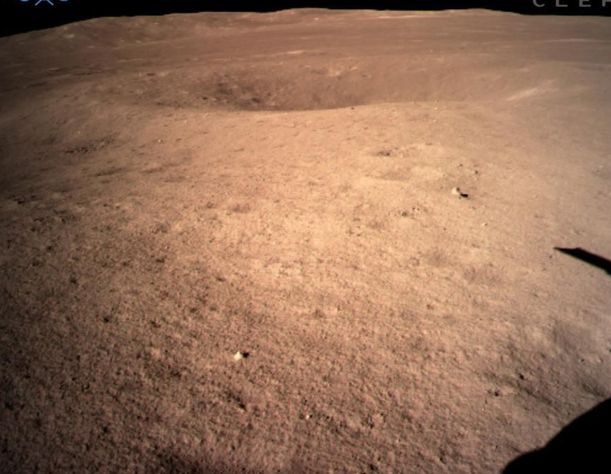 图片为嫦娥四号着陆器监视相机C拍摄的着陆点南侧月球背面图像,巡视器将朝此方向驶向月球表面。