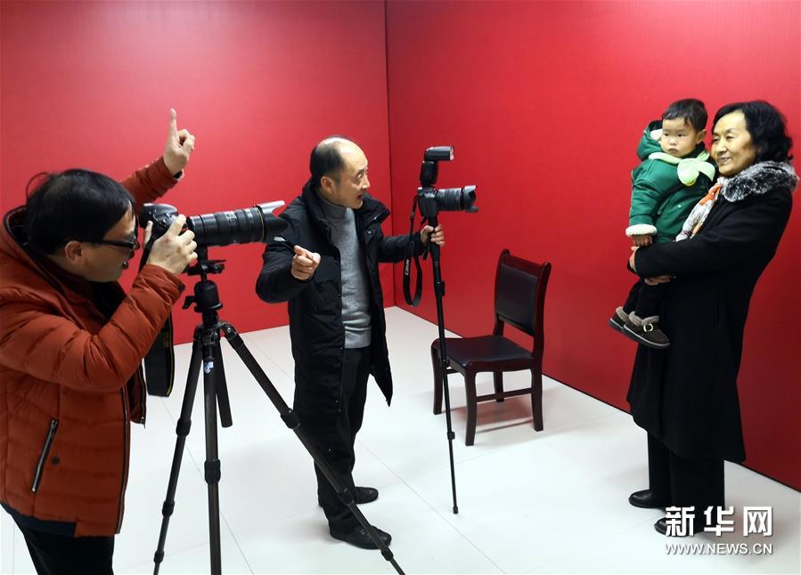 1月3日,浙江省摄影家协会文艺志愿者在杭州市萧山区义桥镇民丰村为群众拍摄全家福。新华社 记者王小川/摄