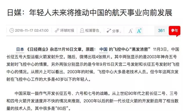 日媒还称,中国采取一鼓作气开发长征五号、六号和七号的战略。从上世纪90年代之前长征二号、三号和四号火箭开发速度并不快的情况来推测,2000年以后的新一代长征火箭的开发新启用了相当数量的技术人员,其中很多是“80后”。