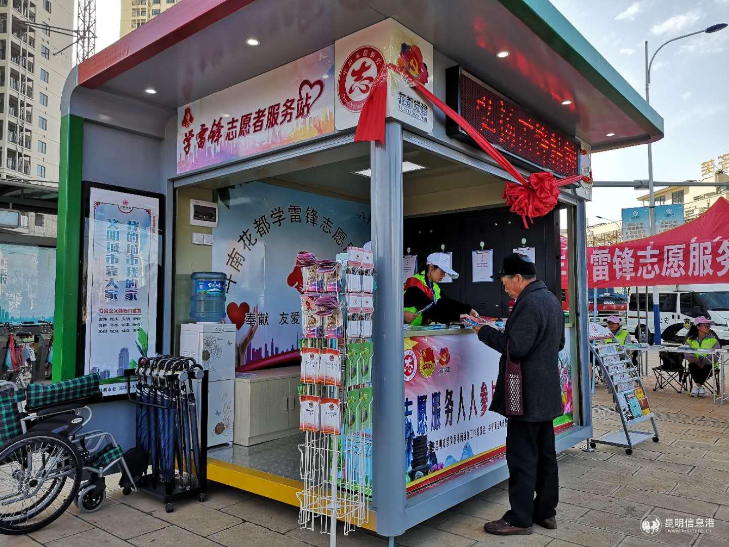 建立学雷锋志愿服务站是呈贡区文明城市创建的一项重要内容。呈贡区斗南花都学雷锋志愿服务站位于斗南花卉小镇的核心区,服务时间为每天早上9点至下午6点。同时,服务站还是昆明斗南特色小镇城市基层党建示范点的重要组成部分,并设置了“花都党建”的标识,旨在展示呈贡区斗南花卉小镇热情好客、服务市民的文明形象。
