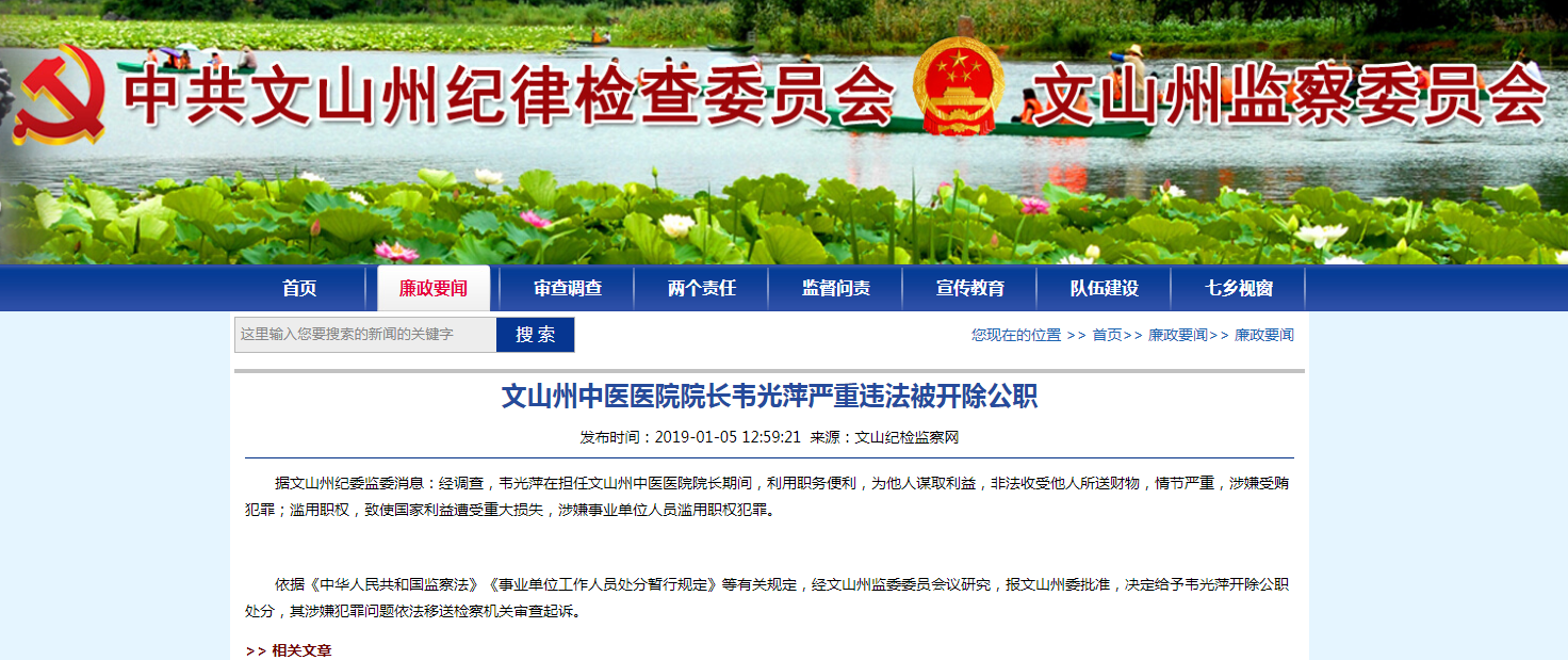 依据《中华人民共和国监察法》《事业单位工作人员处分暂行规定》等有关规定,经文山州监委委员会议研究,报文山州委批准,决定给予韦光萍开除公职处分,其涉嫌犯罪问题依法移送检察机关审查起诉。