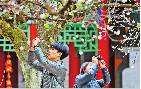 连日来,昆明黑龙潭龙泉观中的两株有着400多年树龄的明代古梅“龙潭粉”相继开放,繁花枝头香满园,吸引众多市民前来观赏。“龙潭粉”是云南独有的梅花品种,其花色白中带粉,是早梅品种中最早开放的梅花。目前,昆明黑龙潭公园已拥有“龙潭粉”、“红怀抱子”等珍贵品种古梅花69株,树龄最高的“唐梅”已有1300多年的历史。(云南日报 记者杨峥/摄)