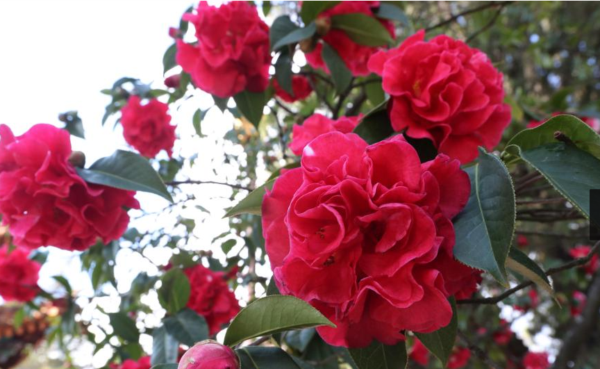 按照山茶花“一年长花一年长叶”的生长规律,“殿前红”在今年正好是花期,因此也是花朵数量最多、观赏效果最佳的一年。(云南网 记者杨峥摄)