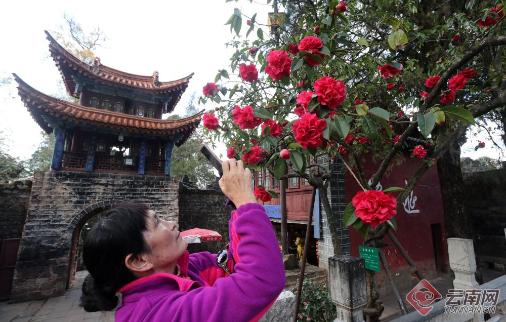 昆明金殿名胜区是全国著名的茶花观赏园,眼下正值金殿名胜区第三十一届茶花展之际,早牡丹、早桃红、雪娇等上百种云南山茶和外国茶花的早开品种已进入盛花期,把金殿装点得姹紫嫣红,其中古山茶“殿前红”成为当之无愧的山茶王。已有400多年树龄的“殿前红”是最著名的云南古山茶,其品种为“狮子头”,花型大、数量多、色泽艳,花开时节红艳似火,与历史悠久的金殿交相辉映,而得“殿前红”美名。
