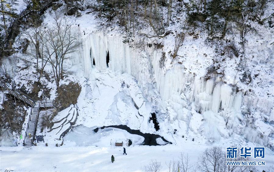 游人在吉林省长白县十五道沟望天鹅景区观赏冰瀑景观(1月3日无人机拍摄)。新华社记者许畅/摄