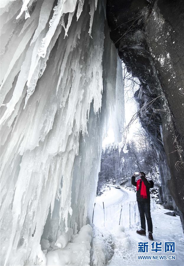 游人在吉林省长白县十五道沟望天鹅景区内拍摄冰瀑景观(1月3日摄)。新华社记者许畅/摄