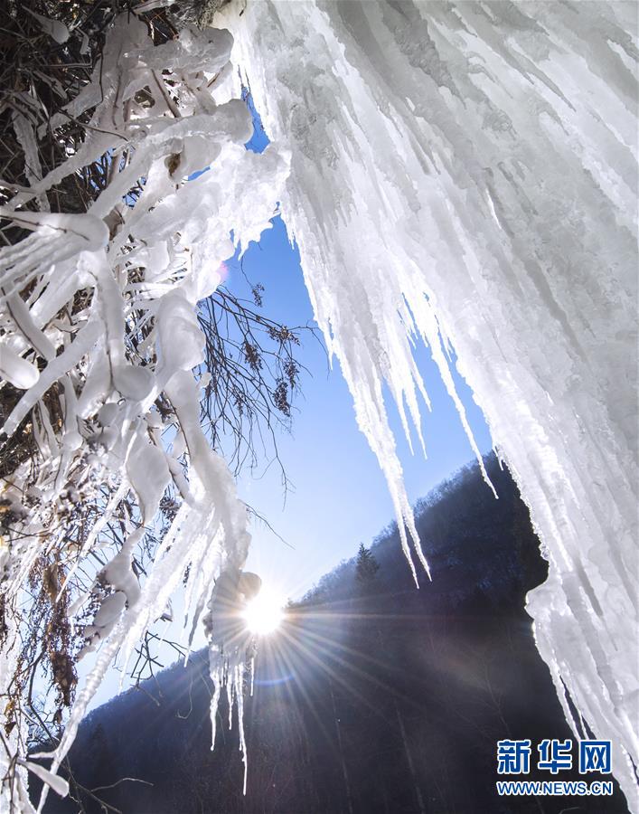 这是在吉林省长白县十五道沟望天鹅景区拍摄的悬于石壁间的冰凌(1月3日摄)。新华社记者许畅/摄