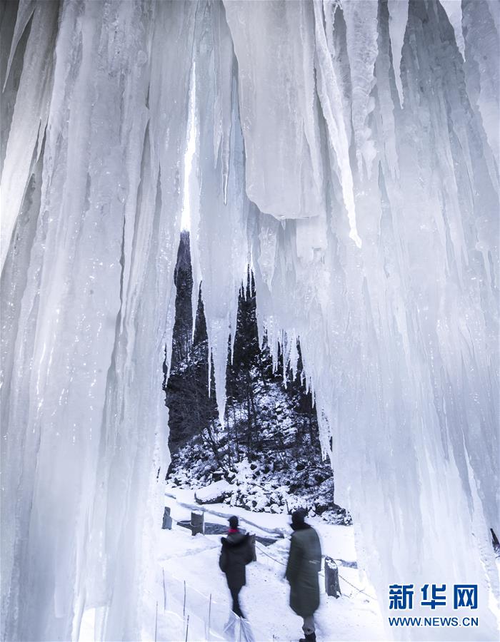 游人在吉林省长白县十五道沟望天鹅景区内观赏冰瀑景观(1月3日摄)。新华社记者张楠/摄