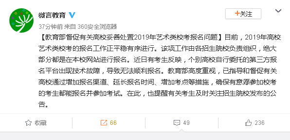 目前,2019年高校艺术类校考的报名工作正平稳有序进行。该项工作由各招生院校负责组织,绝大部分都是在本校网站进行报名。近日有考生反映,个别高校自行委托的第三方报名平台出现技术故障,导致无法顺利报名。教育部高度重视,已指导和督促有关高校通过增加报名渠道、延长报名时间、增加考点等措施,确保有意愿参加校考的考生都能报名并参加考试。在此,也提醒有关考生及时关注招生院校发布的公告。