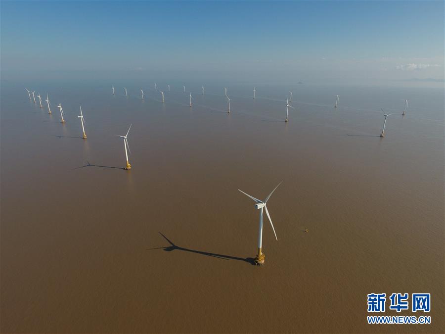俯瞰上海东海大桥海上风电场(2017年11月2日摄)。新华社 记者丁汀/摄