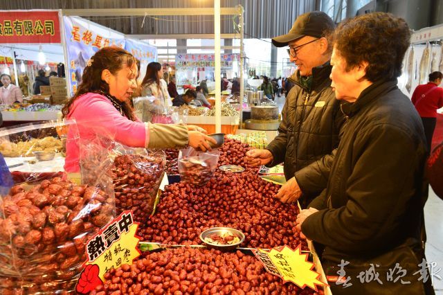 年货展区,有各地各类土特产、水果、绿色食品、糖果等。