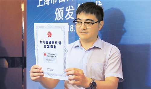 2018年9月19日,上海为首批30位台胞颁发居住证。图为台胞在展示台湾居民居住证。 (新华社发)