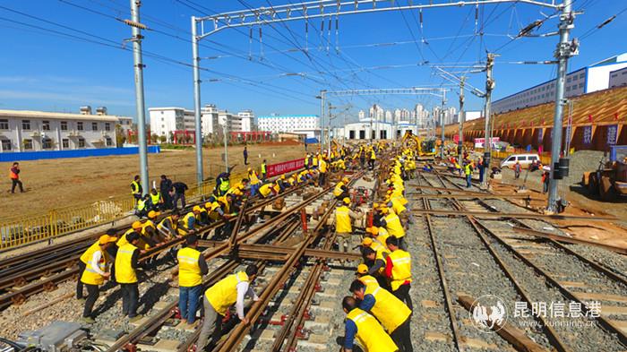 据此次站改施工负责人中铁十一局三公司昆枢项目部李世龙介绍,昆明动车所新建12条存车线,以及“一段两所”轨道工程由中铁十一局集团承担。工程是一项开工即大干的重难点工程,具有时间紧、任务重、技术难度高、工期压力大的特点,所有钢轨、道岔、扣配件、道砟等重要物资均面临“等米下锅”的窘况。工程开工以来,累计完成“天窗”28个,其中施工高度集中在12月,当月实施“天窗”24个。共铺设道岔31组、线路13.7公里;每天组织专业施工队作业人员近300人;投入大型施工机具10余台。参建人员用30天时间,完成了常规三个月都不可能完成的工作量。