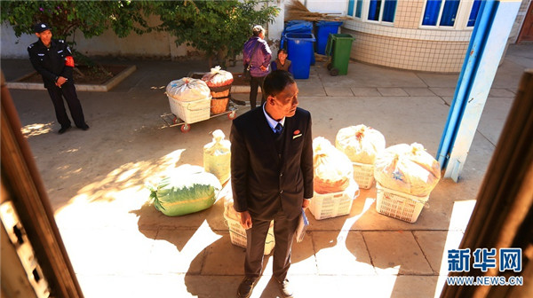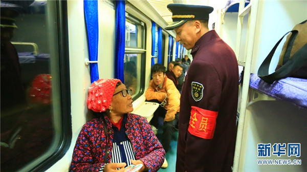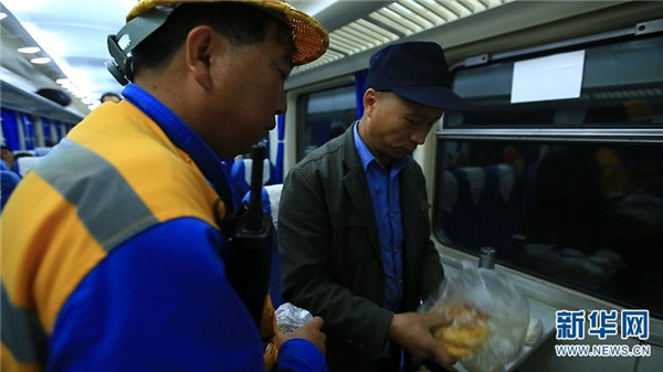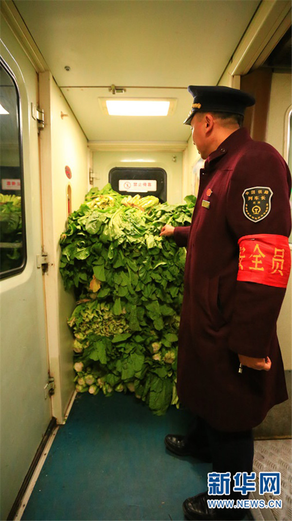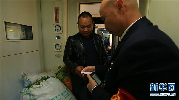 图为列车长杨兆祥正在检查沿途村民带上车的农产品。
