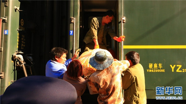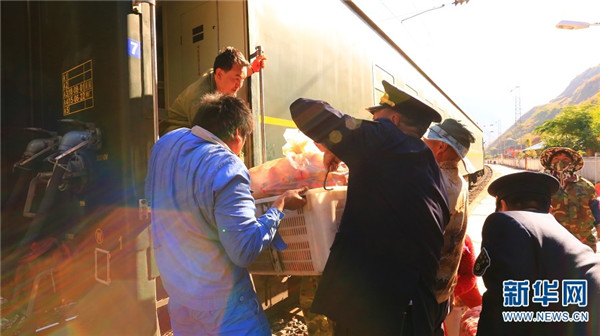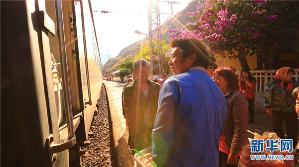 图为列车员正在帮助沿途村民们将货物搬上车厢。