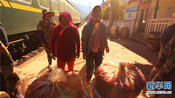 在广通北站上车的村民王翠琼这次带了20多公斤的白菜,她要去甸心照顾生病已久的父亲。王翠琼认为乘坐列车比班车所耗的时间更短,费用更便宜。