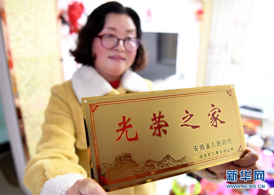 1月14日,合肥市包河区常青街道居民魏松梅在展示领到的“光荣之家”牌。新华社记者刘军喜/摄