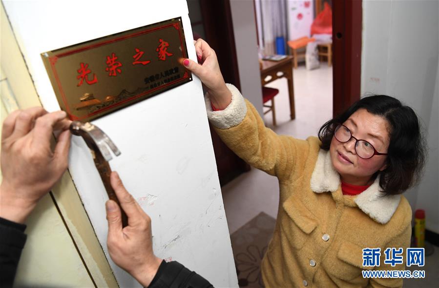1月14日,合肥市包河区常青街道工作人员在居民魏松梅(右)家门口悬挂“光荣之家”牌。新华社记者刘军喜/摄