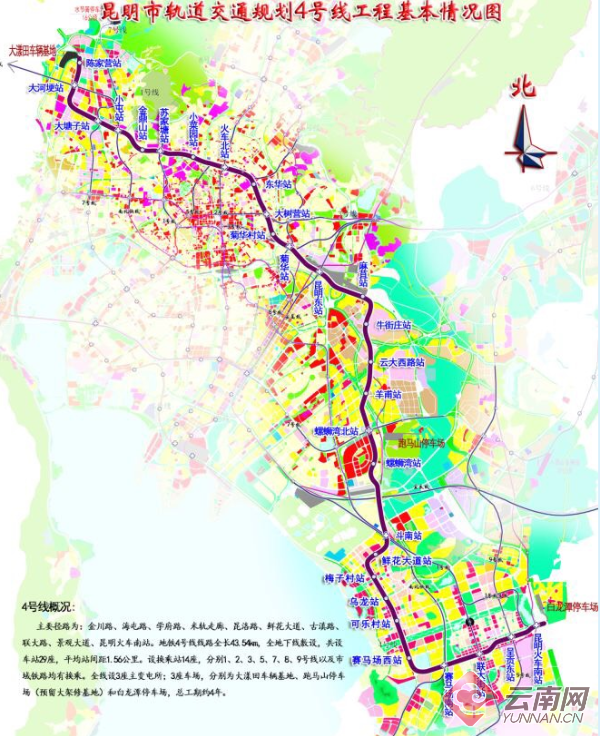 昆明地铁4号线北端起于陈家营站,南端止于昆明火车南站,串联了主城西北的国家高新技术产业开发区、主城中心区、主城东南的国家经济技术开发区,并向南连接呈贡新城。