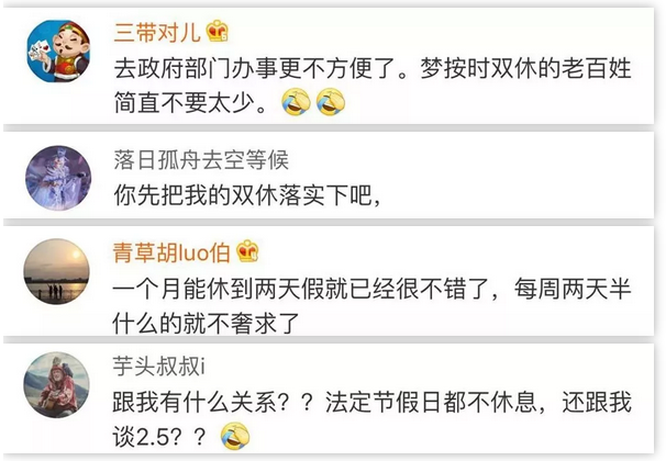 但也有网友认为:这样办事就更不方便了,并自嘲“连双休都没有”。