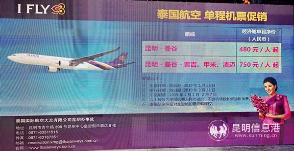 此外,春节假期即将来临,泰国国际航空大众有限公司昆明办事处为福利去泰国旅游的中国游客,特推出了“2人同行优惠价”和“冬季单程特价促销”活动,昆明-曼谷单程机票低至480元/人(不含机场税和燃油附加费) 。