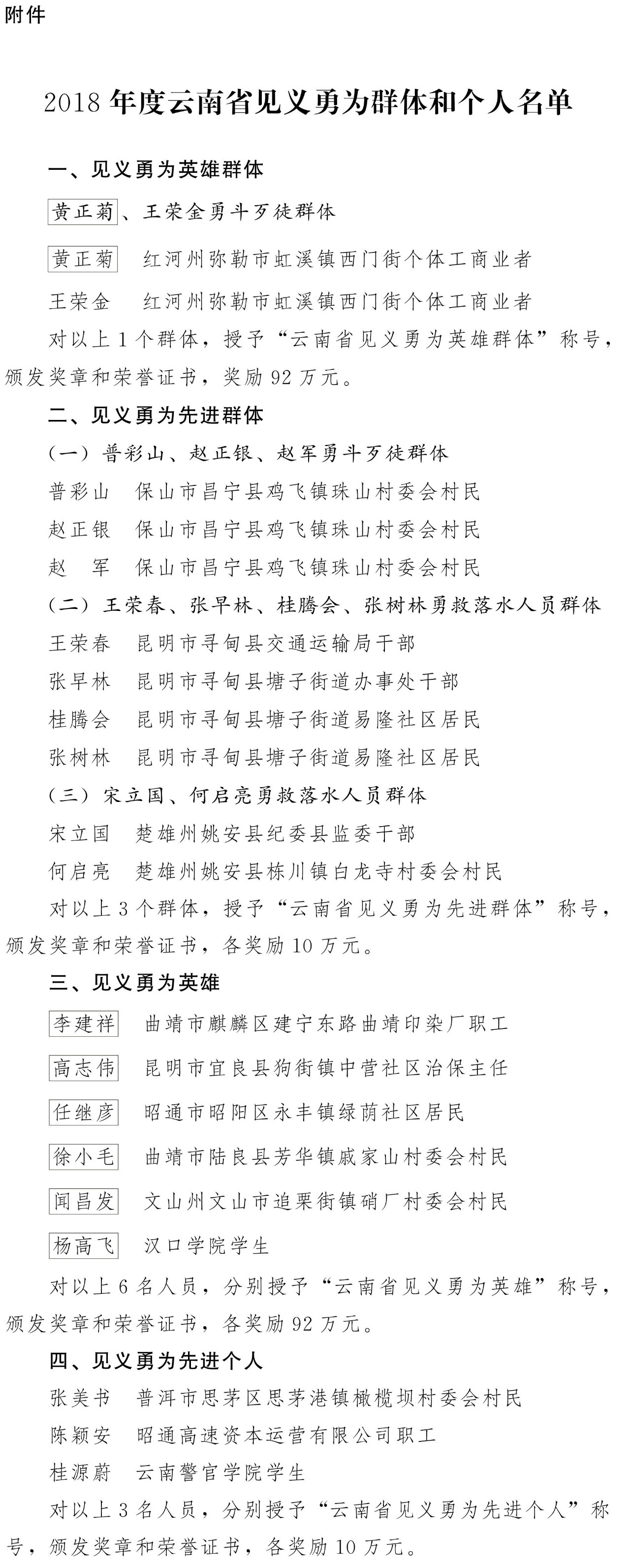 1月16日,云南省人民政府下发《云南省人民政府关于表彰奖励2018年度云南省见义勇为群体和个人的决定》,对黄正菊、王荣金见义勇为英雄群体,李建祥、高志伟等见义勇为英雄进行奖励。