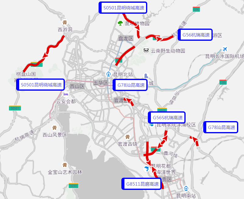 S0501昆明绕城高速(茨坝路出入口-G56杭瑞高速入口方向路段)1月26日14:00~ 22:00易拥堵,预计拥堵时长9小时;