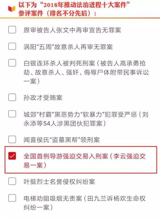 6686体育讯 1月14日至1月20日,由最高人民法院与中央电视总台联合举办的“2018年推动法治进程十大案件”评选活动进行网络投票。李云强迫交易一案成功入选,这是我省景洪市人民法院审理的全国首例导游强迫交易案。今天是投票最后一天,请广大网友积极投票支持李云强迫交易一案。