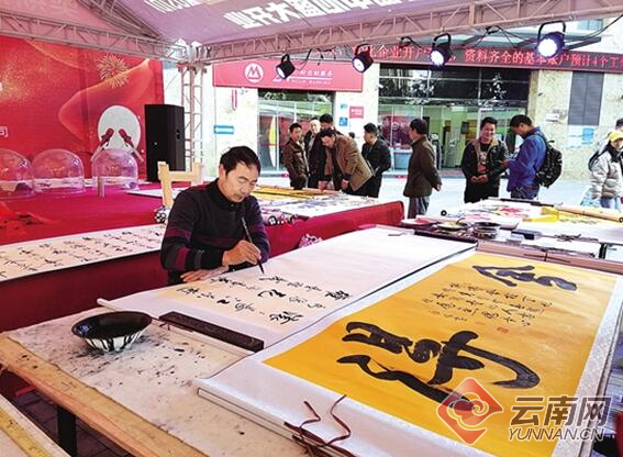 此外,年货街门口还有来自全国各地的书法绘画爱好者现场进行书法和绘画创作。