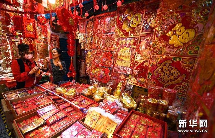 1月20日,在台北市迪化街年货大街,商户在售卖春节饰品。 春节临近,位于台北市迪化街的年货大街年味十足,各式年货琳琅满目,吸引众多市民前来采购。新华社记者李响/摄