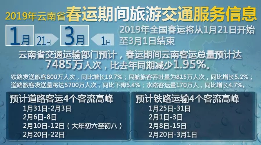 春运期间,预计云南省出程较为分散,高速公路在1月26日7:00至10:00为出程小高峰;受假期结束人群返程影响,预计高速在2月10日(初六)14:00至17:00为返程高峰。