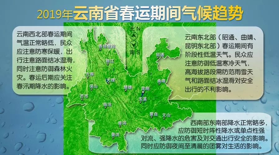春运首日(21日)昆明以东以北地区有降温降雨天气,旅游出行需注意行车安全。昭通北部高海拔地区会出现雨夹雪或小雪,需注意防范道路结冰对行车的影响。