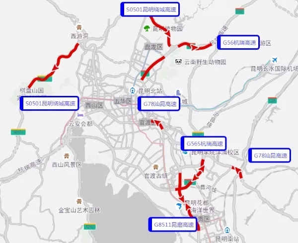 S0501昆明绕城高速(茨坝路出入口-G56杭瑞高速入口方向路段)1月26日14:00~ 22:00易拥堵,预计拥堵时长9小时;