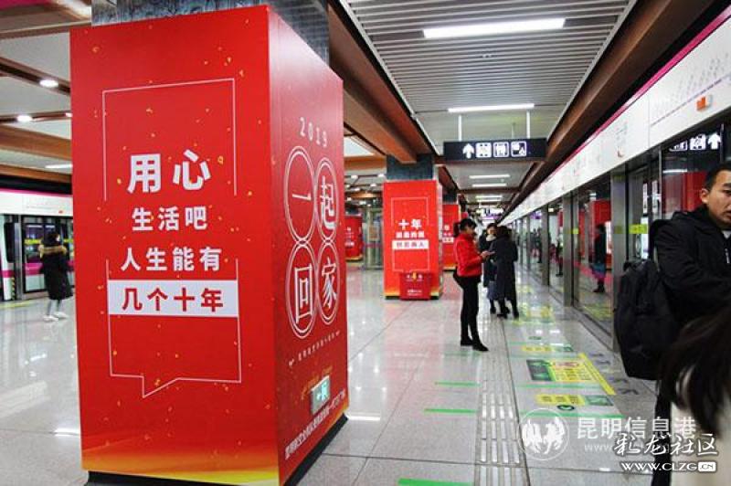 2019年是昆航开航的第十年,同时也是昆明轨道交通有限公司成立的第十年,在五一路站口,鲜艳的红色装饰映入眼帘,“2019一起回家”的口号温暖了冬日的旅途,烘托出了春节的喜庆氛围。楼梯、通道、站厅柱子上写满了围绕“十年”的感人语录,“十年前睡我上铺的哥们儿,上个月结婚了”“十年,不念过往,不畏将来”…… 近百句打动人心的创意文案,勾起了大家关于“十年”的回忆与共鸣,吸引着乘客们纷纷驻足拍照。