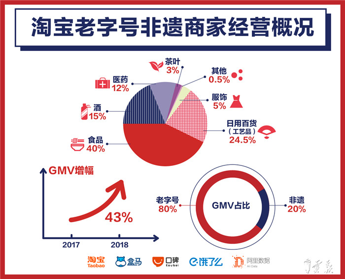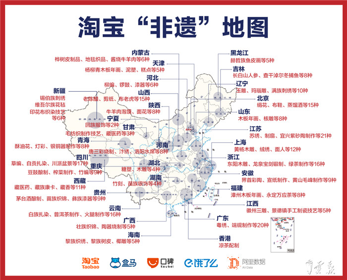 一直以来,淘宝就是“非遗”手艺、中华老字号对外展示、与消费者互动的第一平台。目前,在商务部认定的1128家中华老字号企业中,有超过7成的近800个老字号在淘宝、天猫开店。而根据文化和旅游部非遗司国家级“非物质文化遗产”名录,有近5成“非遗”手艺在淘宝上得到了实践与传承,从事“非遗”产业的淘宝商家遍布全国。