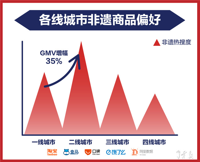 如今,通过淘宝,越来越多非遗、老字号产品正在重新焕发生机,进入到消费者的视野。从剁手力上来看,二线城市消费者对非遗普遍具有很深的情感记忆,他们在这块领域上的花销比一线城市高出35%。其中,主要消费分布在酒、医药、百货、食品这四个品类中。(云报客户端 记者陈文忠)