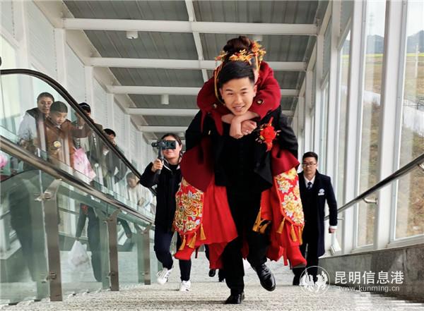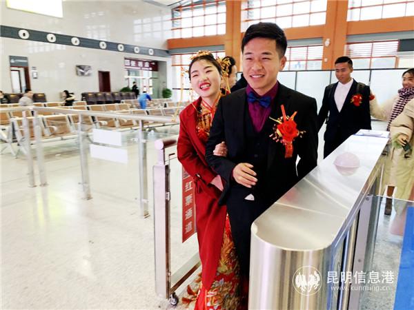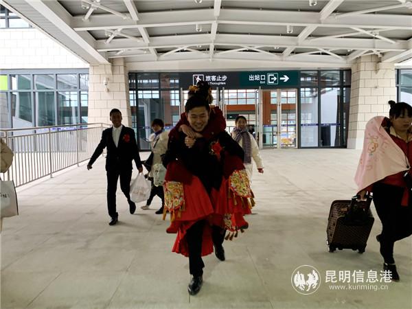 6686体育讯 记者上官艳君 1月21日是春运第一天,中国铁路昆明局集团公司云桂铁路珠琳站迎来一对新人,来自大理的小伙何学强在亲朋友好友陪伴下,乘坐价值上亿的动车迎娶新娘。